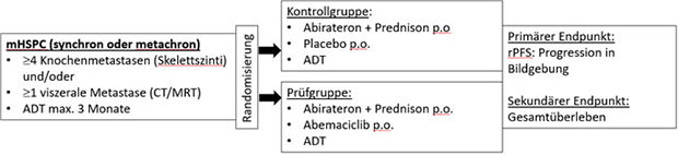 Es handelt sich um eine randomisierte, doppel-blinde, Placebo-kontrollierte Phase-III-Studie. Patienten mit einem mHSPC werden nach dem Zufallsprinzip in zwei Gruppen aufgeteilt. Die Kontrollgruppe erhält die Standardtherapie mit ADT + Abirateron/Prednison und ein Placebo-Präparat. Die Prüfgruppe erhält neben der Standardtherapie mit ADT + Abirateron/Prednison das Studienmedikament Abemaciclib.