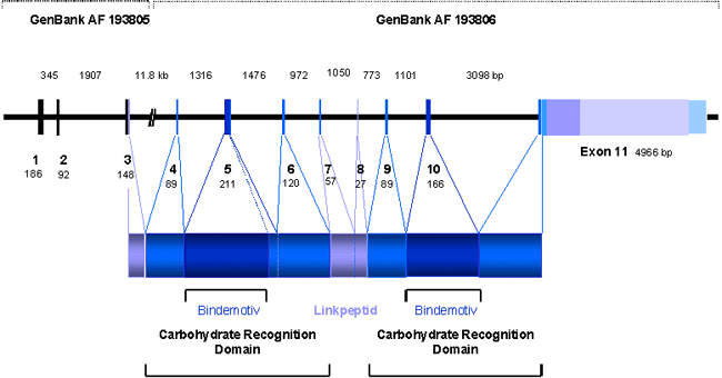Auf dem PCaP-Lokus (1q42) konnten wir über Datenbankrecherche das Gen "prostate carcinoma tumor antigen 1", PCTA-1 entdecken. PCTA-1 wird selektiv in Prostatatumoren exprimiert (Su et al., PNAS, 93, 7252-7257, 1996), was die Vermutung erlaubt, dass es sich bei PCTA-1 um das gesuchte Kandidatengen für das familiäre PCa in dieser Region handelt. Ausgehend von der veröffentlichten cDNA Sequenz ermittelten wir die komplette genomische Sequenz des über 30kb großen Gens mit 11 Exons (Abb. 1). Nach Charakterisierung der Exon/Intron-Genzen waren wir in der Lage in Familien nach Mutationen in PCTA-1 zu suchen, die aufgrund unserer Linkage-Daten um den Bereich 1q42 auf dem PCaP-Lokus koppeln. Die Mutationssuche wird mit dem "enzymatic mutation detection" EMD-System durchgeführt, welches eigens für diesen Zweck etabliert wurde. Zwar konnten wir bislang noch keine Mutationen nachweisen, fanden aber überraschenderweise eine Vielzahl von exprimierten SNPs ("single nucleotide polymorphisms") (Tabelle 2). Diese SNPs dienen jetzt dazu Assoziationsstudien sowohl in den Familien als auch bei sporadischen Fällen durchzuführen.